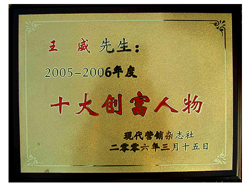 2006年3月15日現(xiàn)代營(yíng)銷(xiāo)雜志社頒給鄭州市一品鮮食品機(jī)械制造廠(chǎng)總經(jīng)理王威先生“20005-2006年度十大創(chuàng)富人物”榮譽(yù)證書(shū)。
