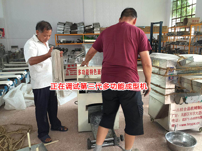 然后工作人員帶領凌大伯來到一品鮮工廠展廳,給凌大伯介紹了不同的設備型號及功能區(qū)別,凌大伯預計后期生產量不是很大,就根據建議定購了全套第三代多功能成型機,并當天下午在工廠進行調試設備。
