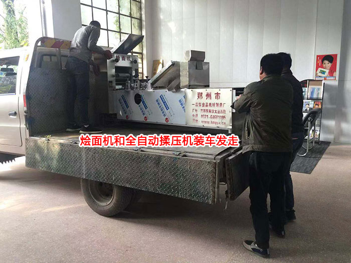 開封杞縣客戶白先生定購(gòu)一品鮮全自動(dòng)揉壓機(jī)和雙輥雙刀燴面機(jī)。在廠進(jìn)行兩天的學(xué)習(xí)后,進(jìn)行設(shè)備調(diào)試,裝車發(fā)貨!