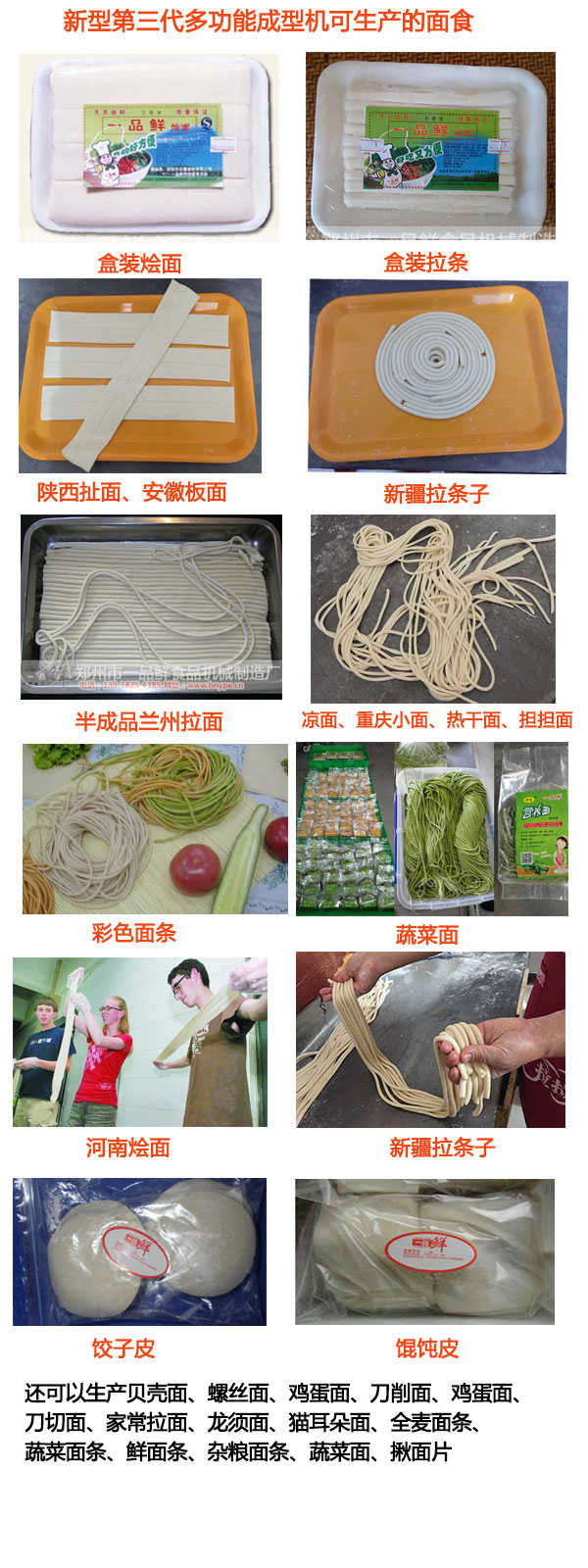 設(shè)備所生產(chǎn)產(chǎn)品品種:河南燴面、東北抻面(手撕面)、陜西、山西扯面、安徽扳面、浙江、福建、拉拉面、四川擔(dān)擔(dān)面、河北拽面、甘肅青海揪面(片)、新疆拉條子、皮帶面、普通鮮面條、掛面、餃子皮、餛飩皮、貝殼面、螺絲面、臊子面、蔬菜面、雜糧面、韭葉面等30余種產(chǎn)品。